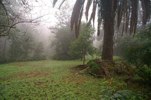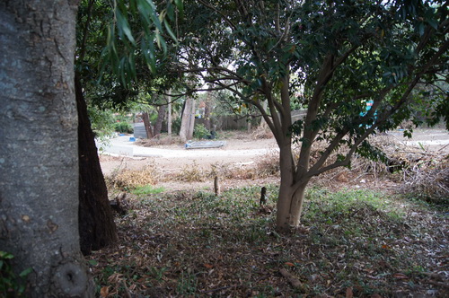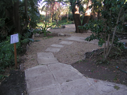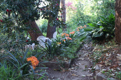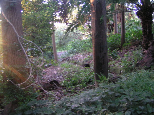 | Looking back up the top path from under the big palm with the house barely discernible through the trees , and now "the Road" | |