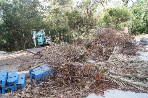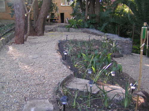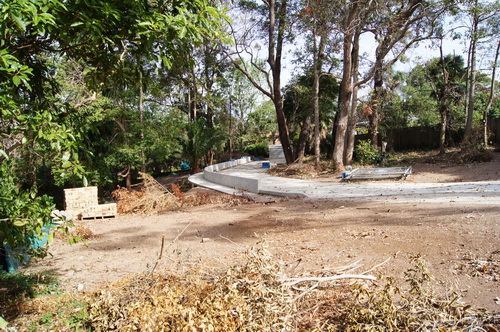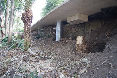 | Looking along the bottom path with palm tree below gabbions and now "the Road" | |