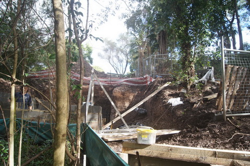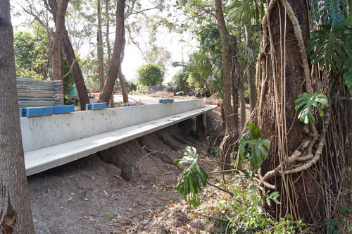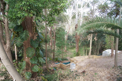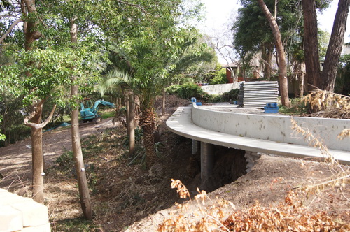 | From the bottom path looking at the gabbions & the "V" shape Ironbark. "the Road" with the gabbions visible underneath on the right hand side. | |