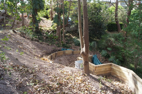 | This underground tank then release the water slowly behind the wooden barricade, allowing the water to soak in to the hillside, the start of the watercourse. | |