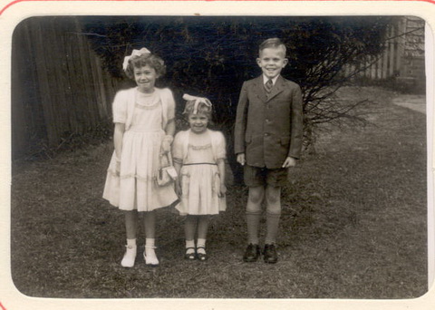 | Margaret watching whislt Neil holds his new little sister Trish, note the chair - see Williams girls pictures. | Don holds Patricia with Neil & Margaret. Probably at Pearl Beach. |